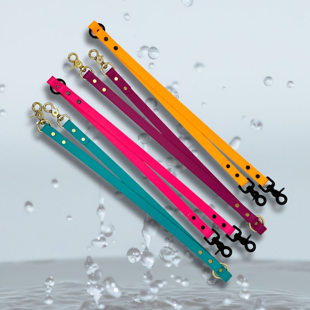 Biothane: is a material made with polyester webbing with a TPU or PVE coating. known as vegan leather, it is waterproof and does not hold odours. It's easy to clean, wash in warm water with soap. It is a Rot and UV-resistant material. (Not recommended for machine washing)