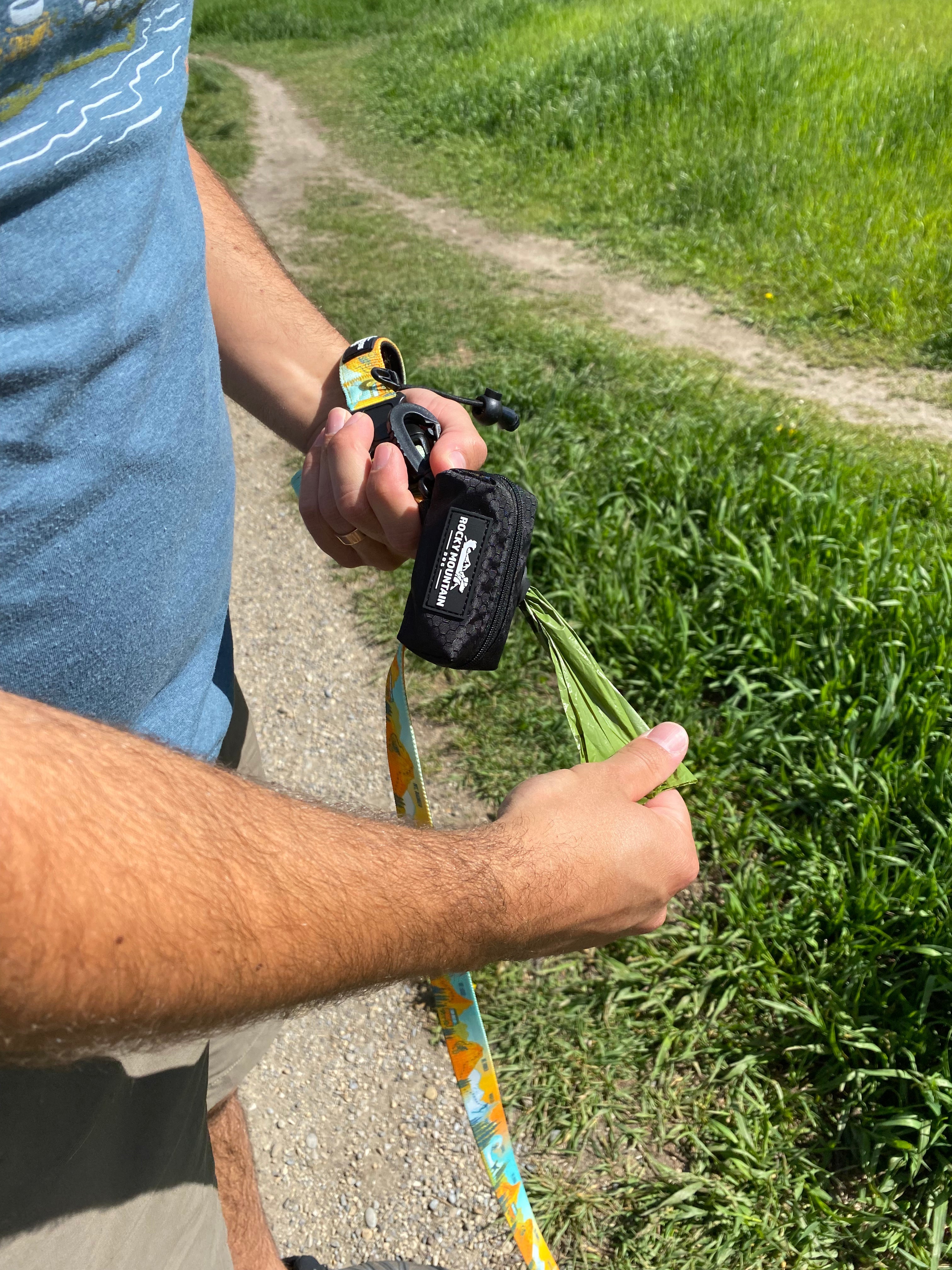 It clips onto your Rocky Mountain Dog leash and it has two velcro strips to prevent the annoying poo bag dangle, this one keeps it snug to your leash and doesn't jingle! Just pull and rip your poo bag and the dispenser will easily hold the next bag at your fingertips.